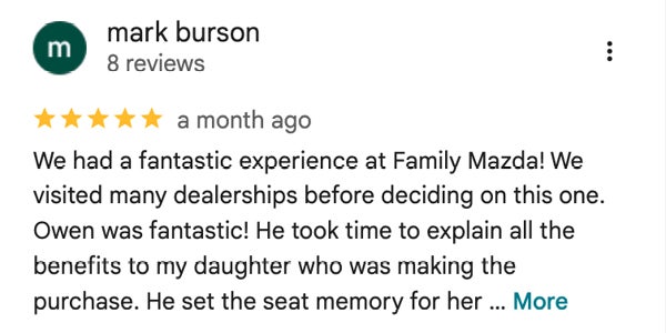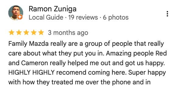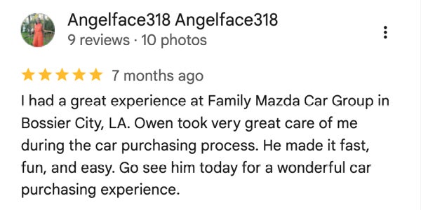 You're officially part of the Family Mazda of Bossier City lineup. We value your feedback more than anything. Please share your story with our family!